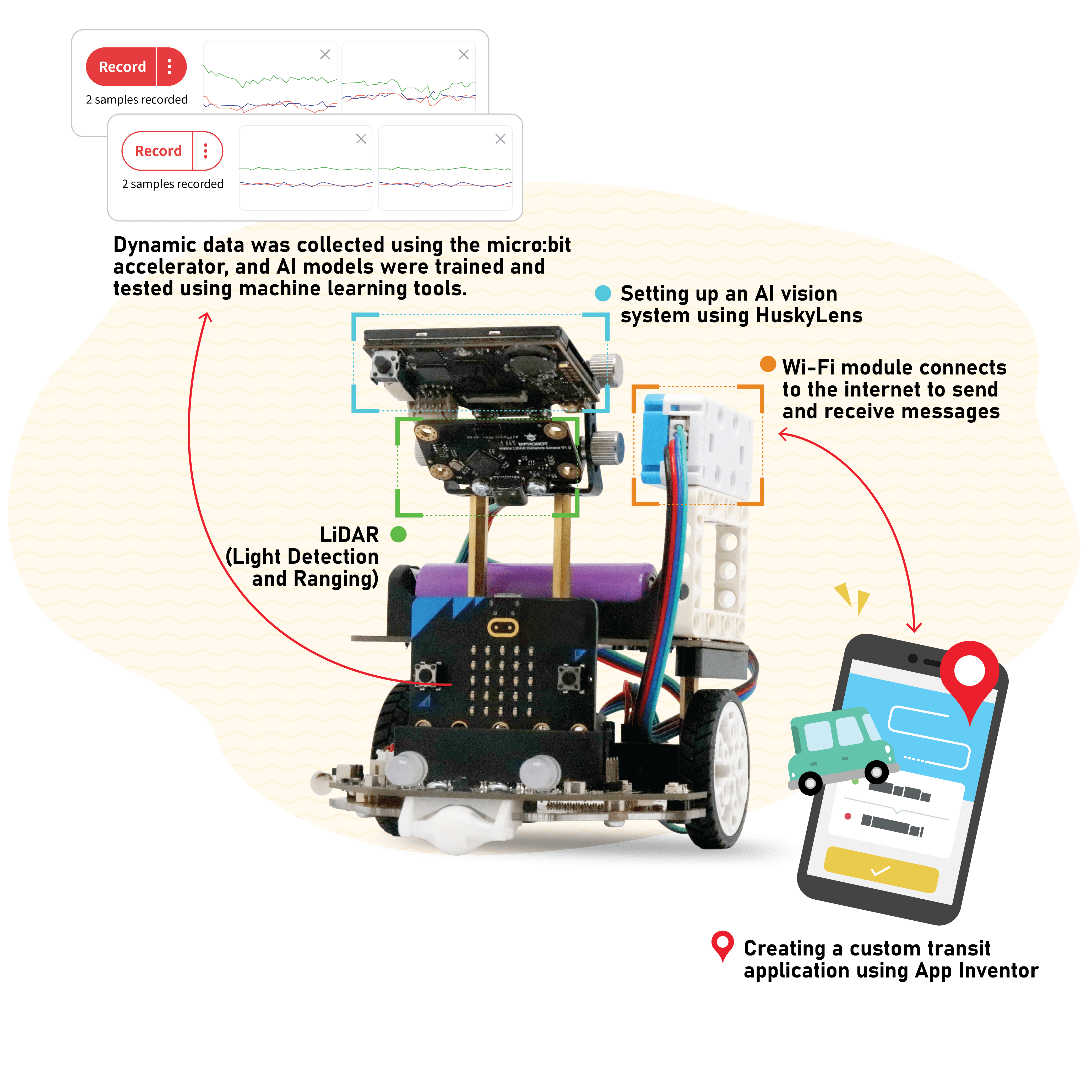 The course delves into the technical principles of LiDAR and its environmental sensing applications. By integrating AI vision systems for data analysis, students will train vehicles to recognize pedestrians, traffic signals, and obstacles. They will use micro:bit accelerometers to collect dynamic data, employ machine learning tools to train and test AI models, and integrate multi-source sensor data to achieve autonomous vehicle decision-making.